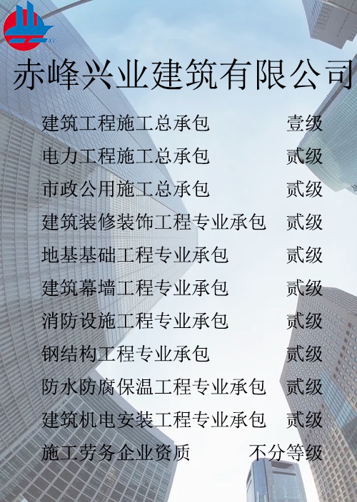 赤峰興業(yè)建筑有限公司簡介 赤峰興業(yè)建筑有限公司成立于1998年7月,位于內蒙古赤峰市松山區(qū)。現(xiàn)已發(fā)展成為擁有建筑工程施工總承包壹級、電力工程施工總承包貳級、市政公用工程施工總承包貳級、承裝、修、試四級、?建筑裝修裝飾工程專業(yè)承包貳級、建筑幕墻工程專業(yè)承包貳級、消防設施工程專業(yè)承包貳級、地基基礎工程專業(yè)承包貳級、鋼結構工程專業(yè)承包貳級、建筑機電工程專業(yè)承包二級、防水防腐保溫工程專業(yè)承包貳級以及建筑施工勞務等資質的綜合性建筑施工企...